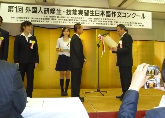 2010年11月14日、福岡県外国人技能実習生受入組合連絡協議会主催による第2回外国人技能実習生日本語作文発表コンクールが開催されました。弊組合からは10期生の杜明明さんが作品を応募しました。数多く寄せられた作品の中より第1次選考が行われ、杜さんの作品は見事に最終選考の10作品に選ばれ、当日の作品発表のステージに上がりました。